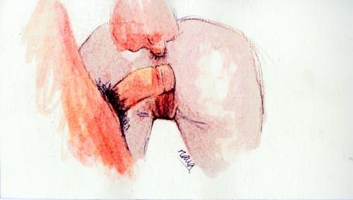 The duality between the violence of explicit sex and the softness of watercolor as a technique is her inspiration in this series of traditional paintings.
